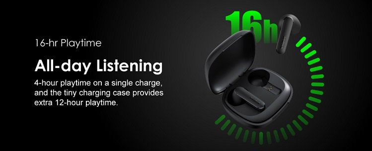 Oraimo Roll Wireless in Ear Earbuds run 4-hour playtime on a single charge, and the tiny charging case provides extra 12-hour playtime.