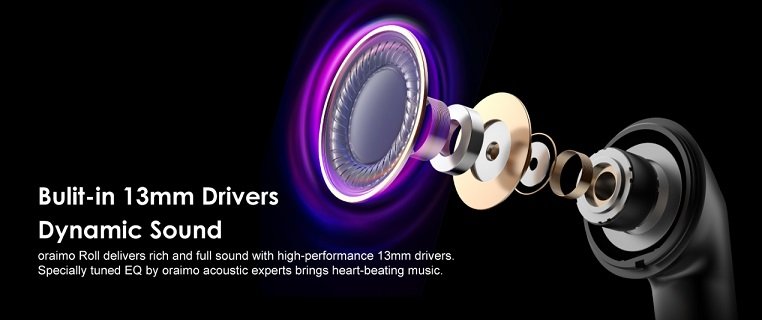 oraimo Roll delivers rich and full sound with high-performance 13mm drivers. Specially tuned EQ by oraimo acoustic experts brings heart-beating music.